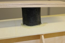Am Rand des Nasenspantes habe ich ca. 25 mm Balsaleisten aufgeklebt. Darin (sieht aus wie Caviar) ca. 600 g Bleischrot mit Harz gemischt. Auf der anderen Seite des Spants kommt nochmal dieselbe Menge, also sind ca. 1,2 kg Blei in der Nase. |