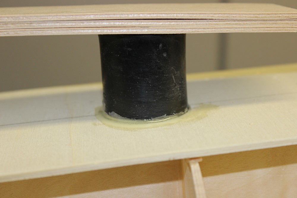 Kufe 3 Stück Frästeile aus 3mm SpH, hinten ein 40mm Durchmesser Schwinggummi mit 8mm Gewindestangen in den Boden geklebt und darauf die Frästeile |