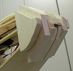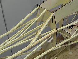 handhaben. Die 2. Leiste steht zu 3/4 über die Spanten hinaus. Dadurch liegt später die Bespannung nicht auf den Spanten auf und es entsteht der Eindruck eines Stahlrohrrumpfes. |