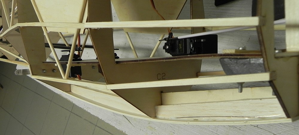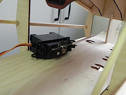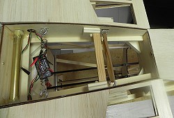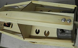 Das Rumpfbrett mit den 2 Leitwerkservos. Vorne kommt der Empf.-Akku rein. An den 6 Nasen kann man Gummis einhaken und den Akku damit befestigen. |