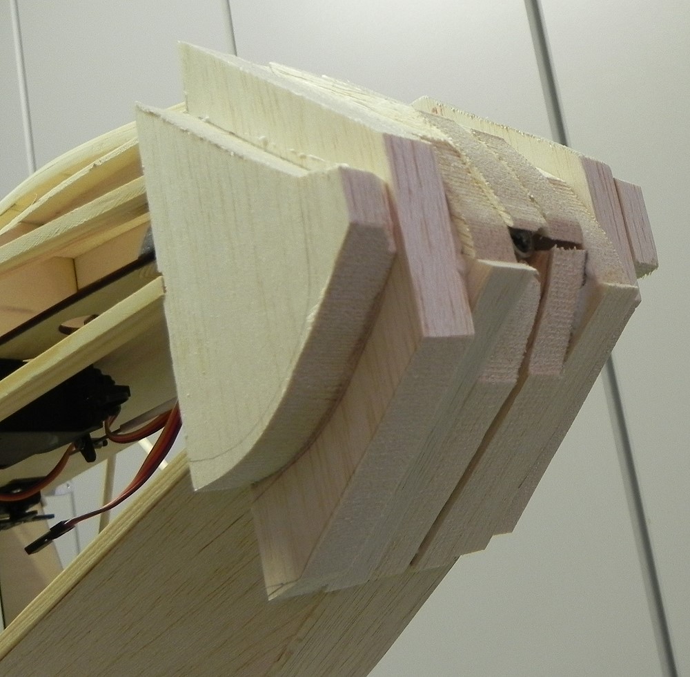 Die Rumpfnase aus 12mm Balsastreifen, innen ist ein Hohlraum, in den später noch Bleikugeln kommen. |