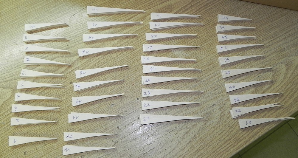 Das sind die Querruderrippen; zum Glück schon handschriftlich mit Nummern versehen. | |