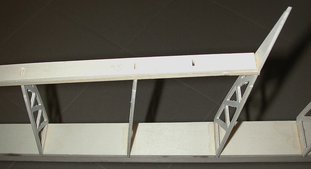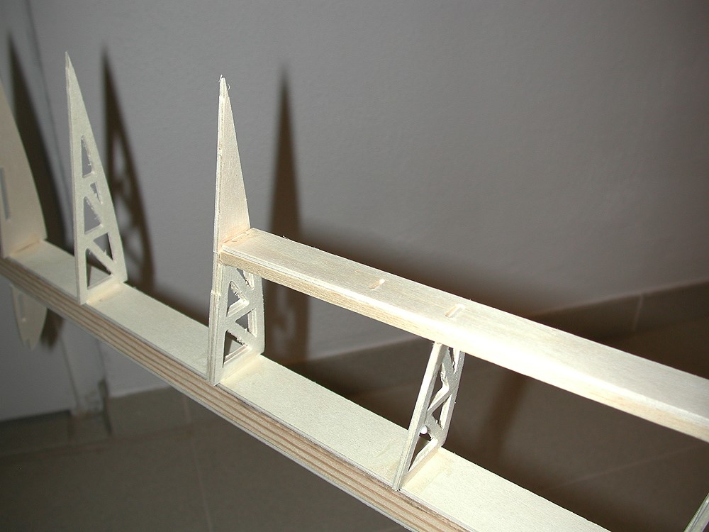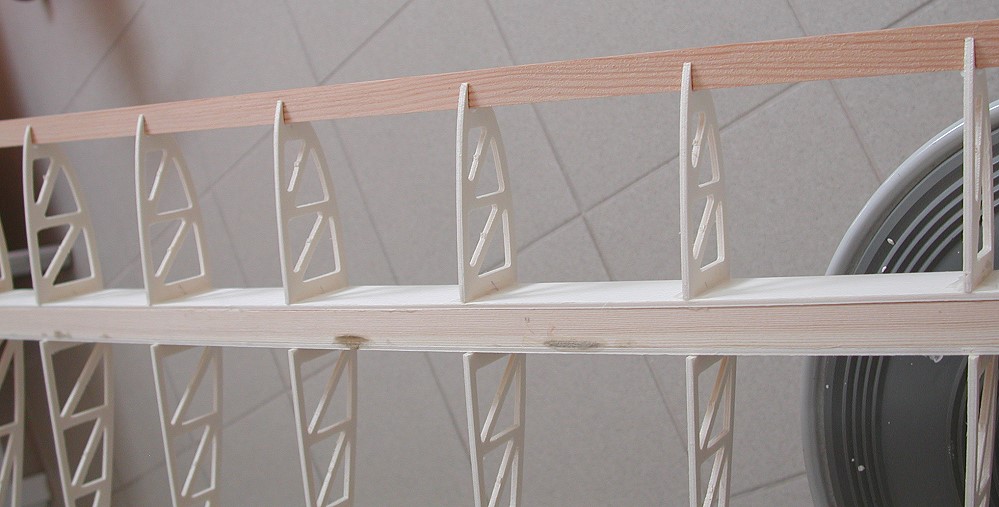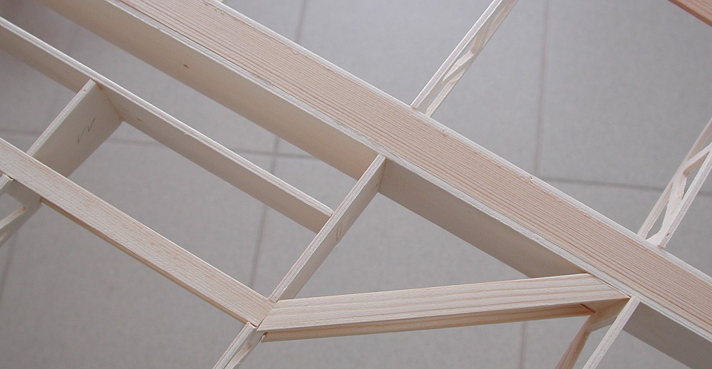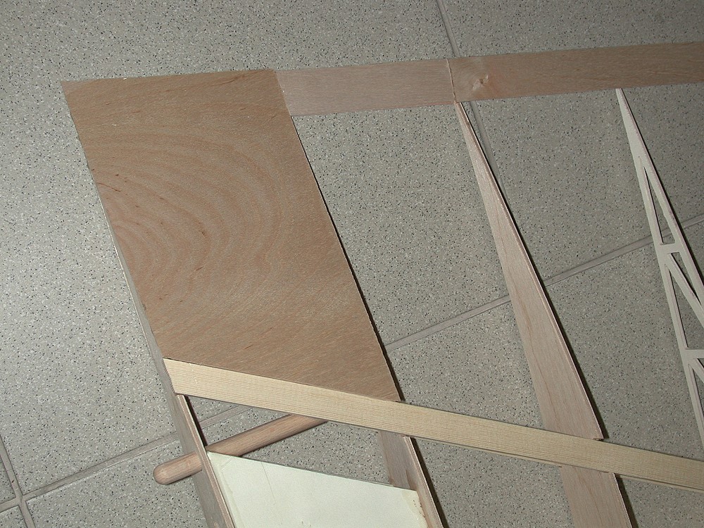3mm Balsa als Beplankung drauf. TIPP! Entlang der schrägen Kiefernleiste habe ich eine 5x3mm Balsaleiste geklebt, damit das 0,6mm SpH nicht durchhängt. |