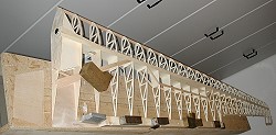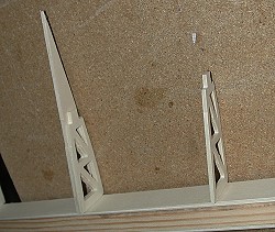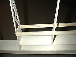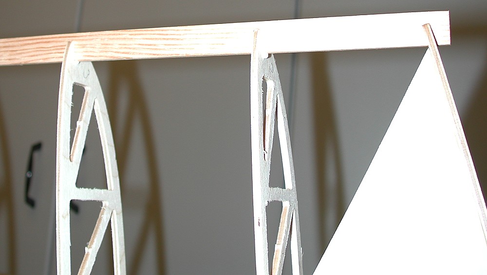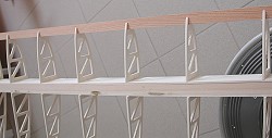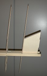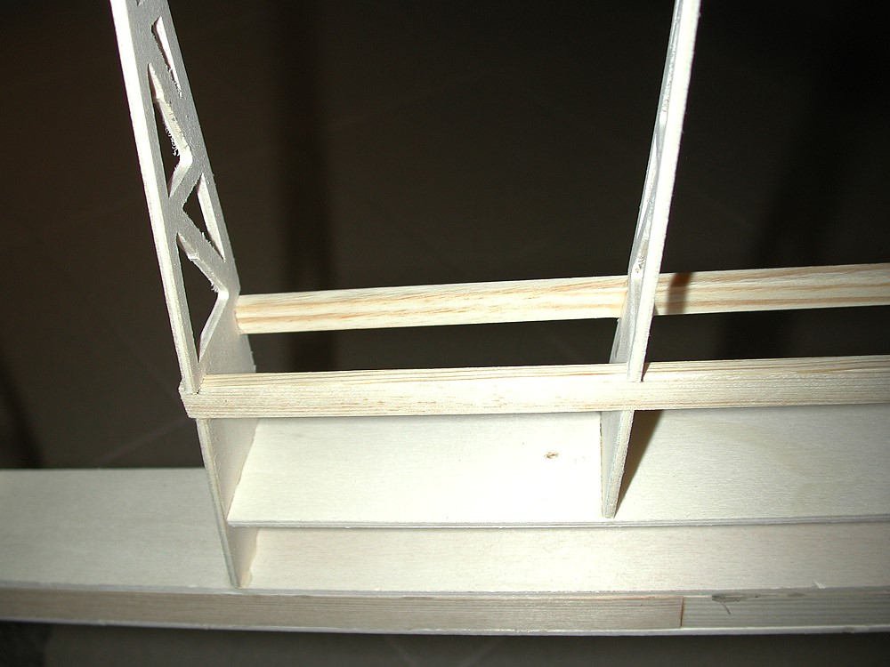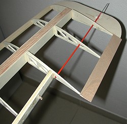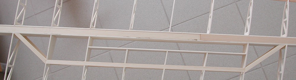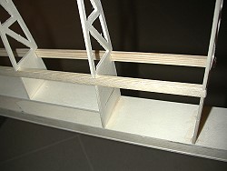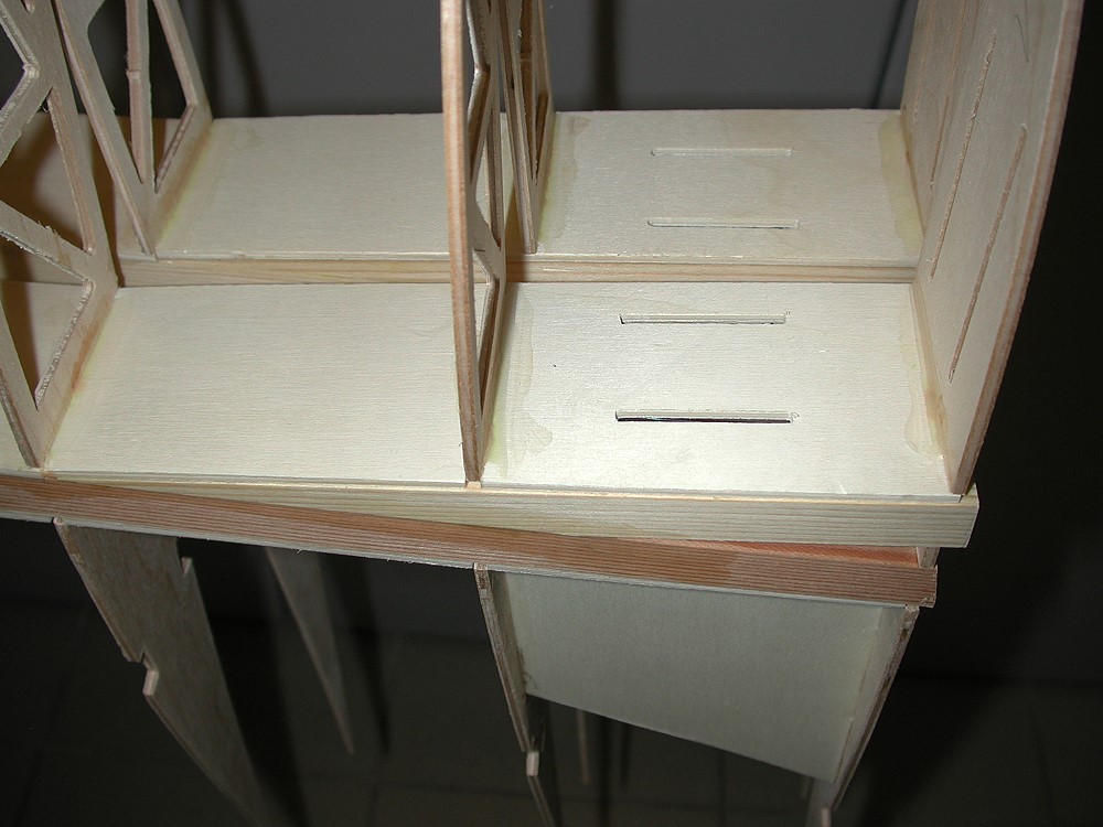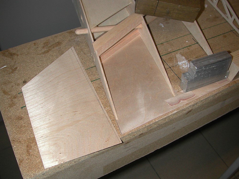 3mm Balsa als Beplankung drauf. TIPP! Entlang der schrägen Kiefernleiste habe ich eine 5x3mm Balsaleiste geklebt, damit das 0,6mm SpH nicht durchhängt. |