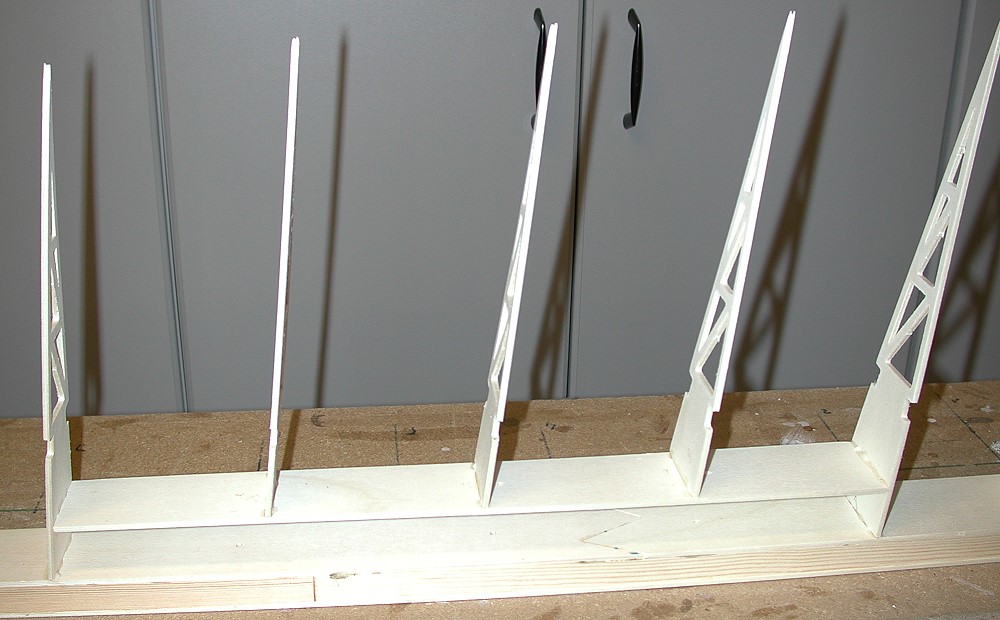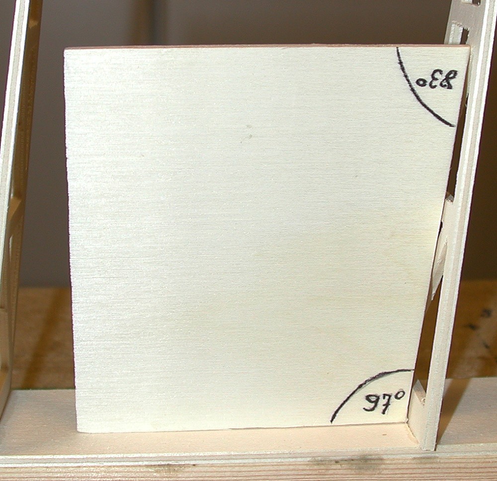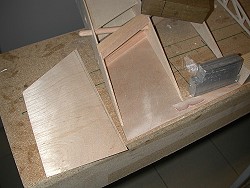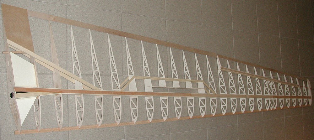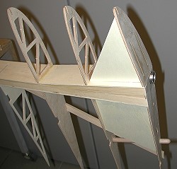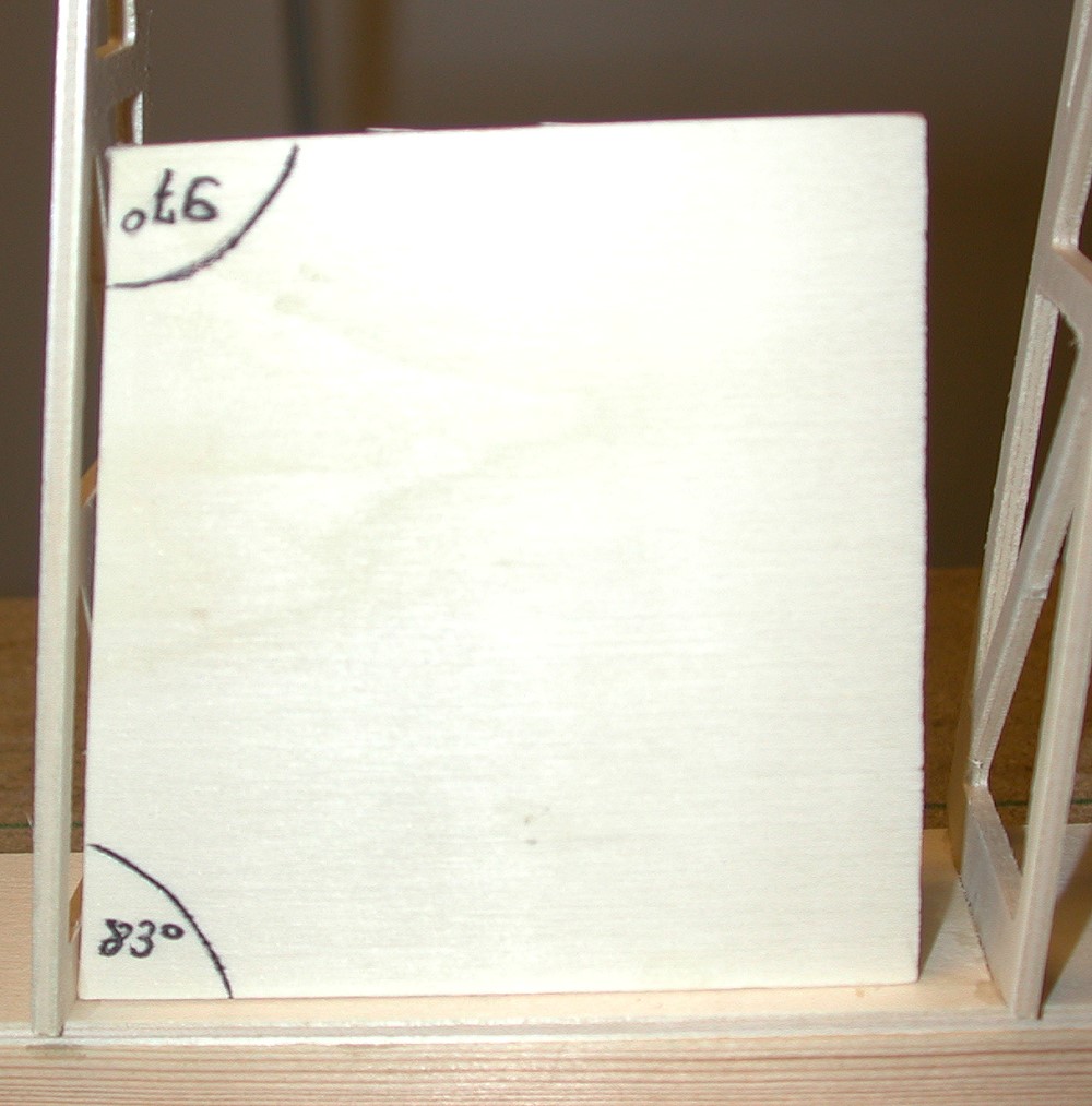 Flügels. Die Rippen stehen damit wieder parallel zur Rumpfachse. Ich habe mir eine Sperrholzschablone mit 7° gemacht, damit ich alle Rippen im richtigen Winkel aufbringen kann. |