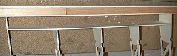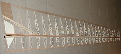 Die Endleiste wird aus 2 Streifen 0,6mm SpH (Breite 2,5cm) hergestellt. Dafür sind die Rippen hinten etwas ausgefräst. Ich lege die Endleiste bis zum aushärten des Klebers auf ein gerades Baubrett und beschwere das Ganze mit Holzleisten und Gewichten. So gibt es keinen Verzug. |