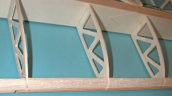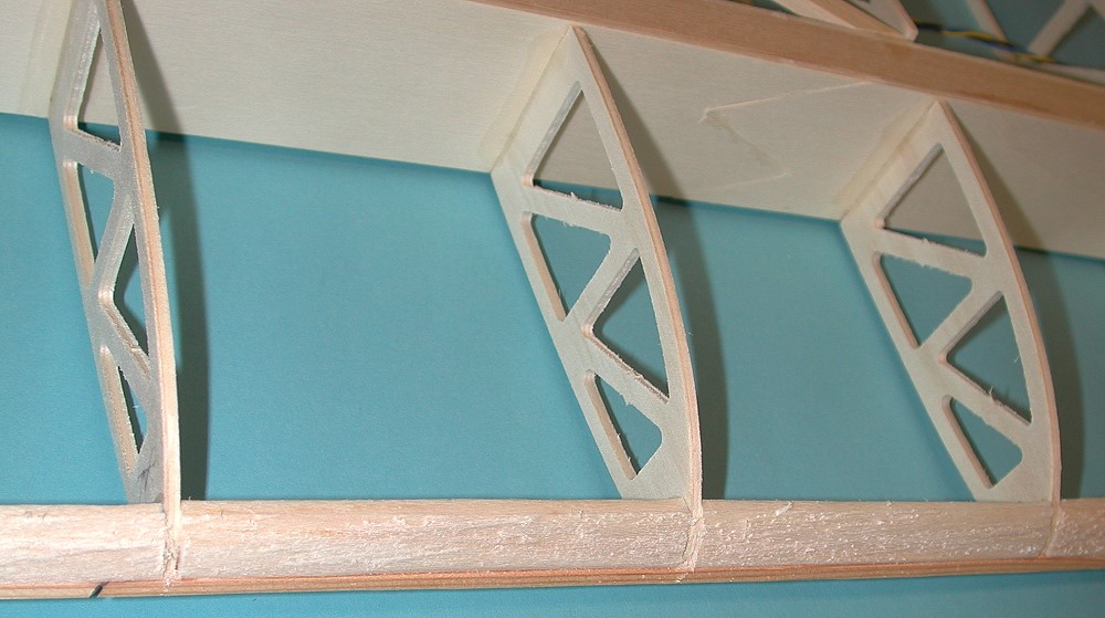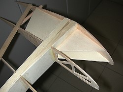 Zur Sicherheit habe ich an die Rippen und die Endleiste Balsa-Dreiecke (3mm, 10x10mm) geklebt. Die Ecken werden dann dem Rippenverlauf entsprechend zugeschliffen. |