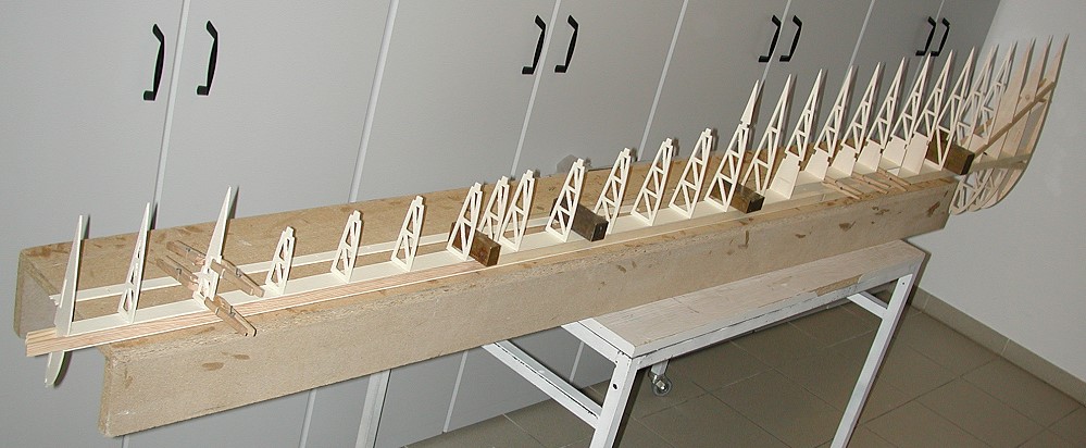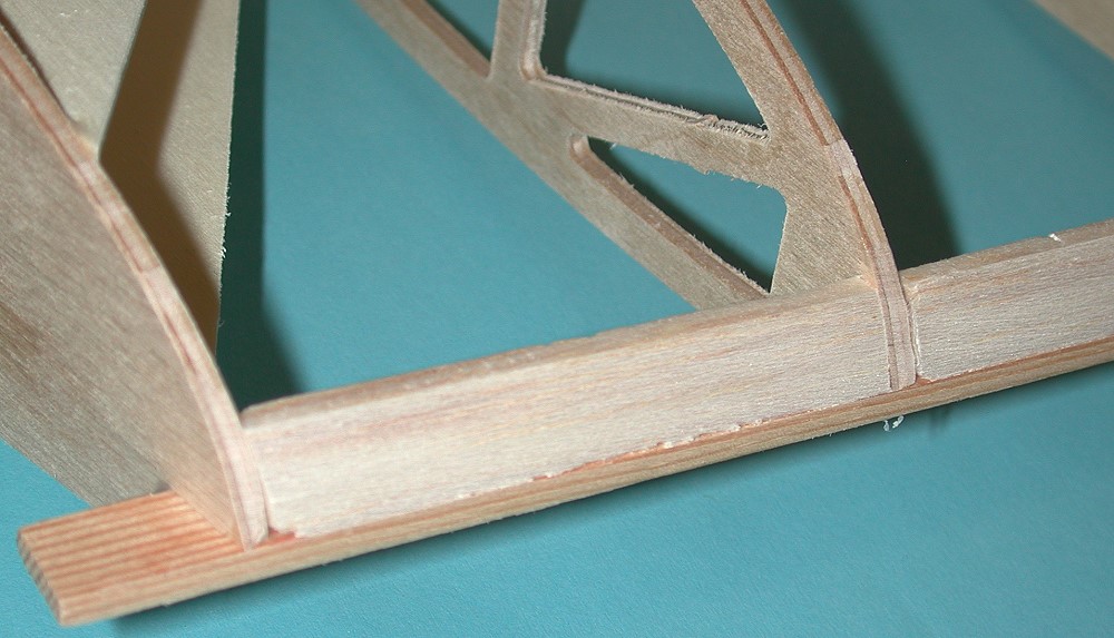 geschliffen. So kriegt das 3mm-Balsa-Brett zur Beplankung Halt. Es geht aber auch anders, jeder hat da so seine Tricks. |