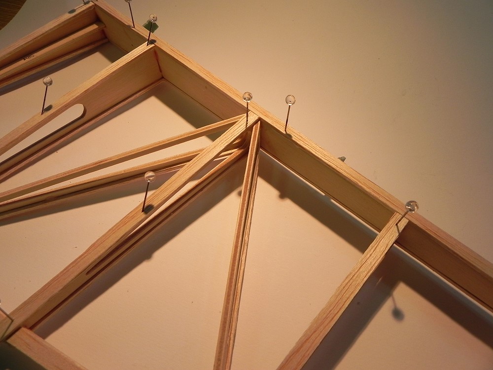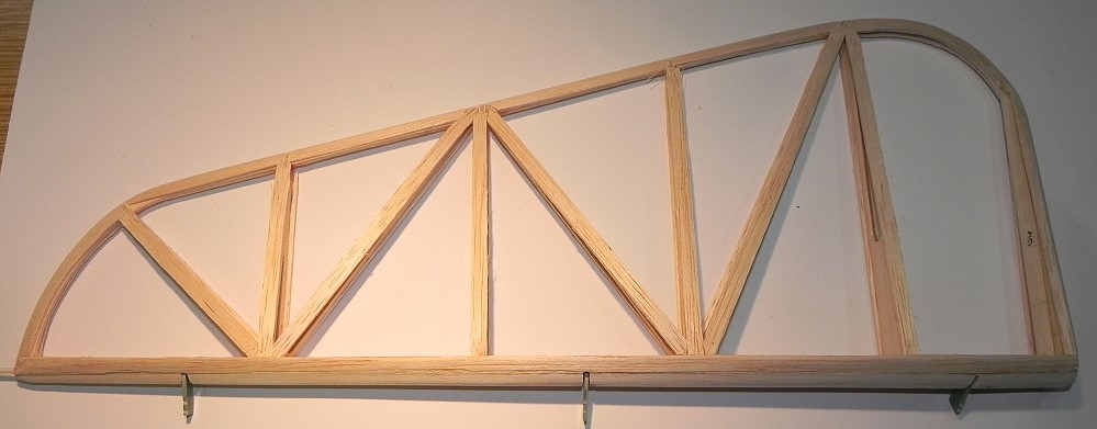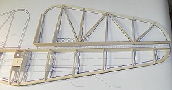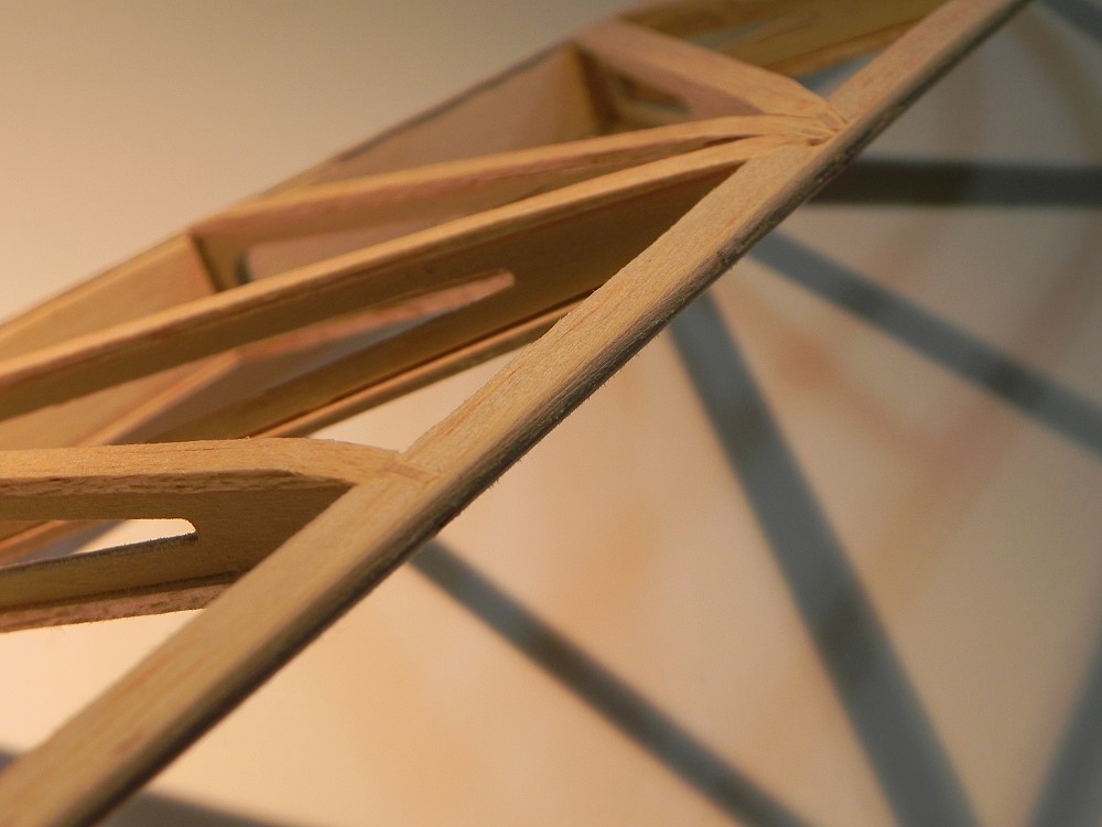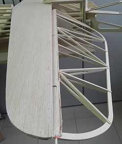 HLW und SLW werden mit 6mm breiten Balsastreifen (2mm) beplankt: Endleiste, Holm, Rippen.