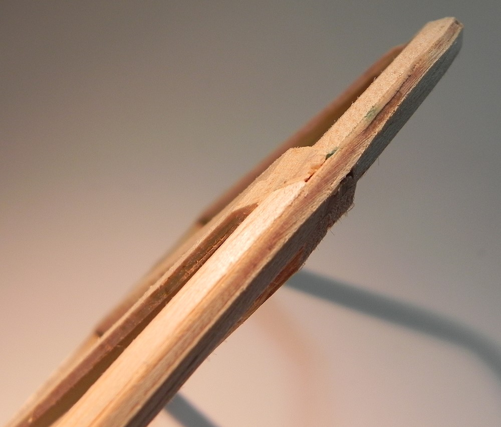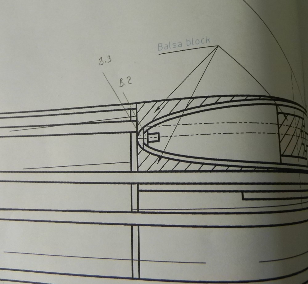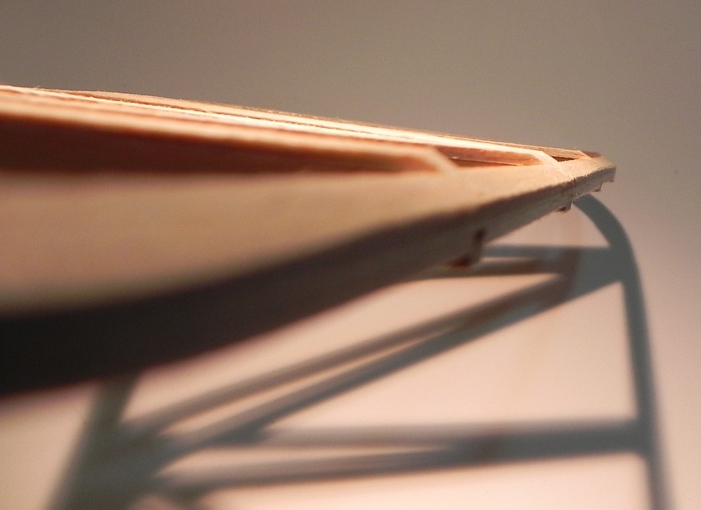 Vorne kommt an die Rippen ein 2mm-Balsastreifen, darüber die 2mm-Balsabeplankung und darauf dann eine 3mm-Balsanasenleiste.