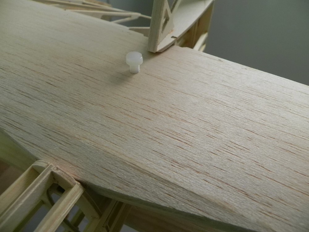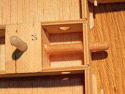 Ein 6er Buchendübel an der Hinterkante des HLW hält das HLW im Rumpf.